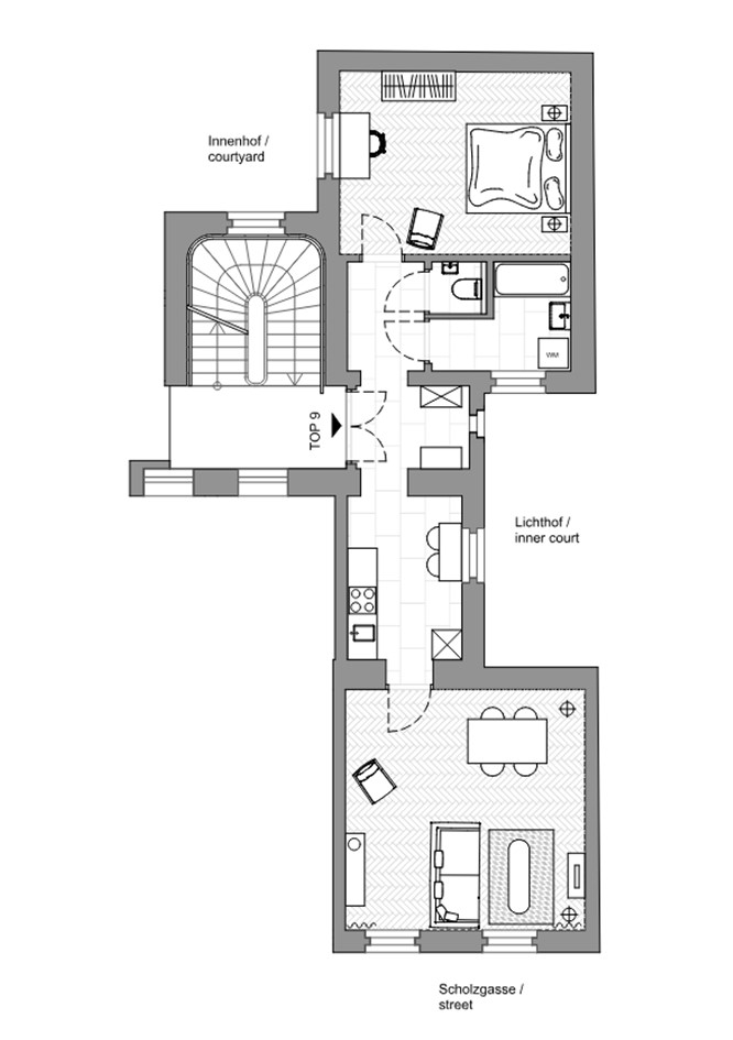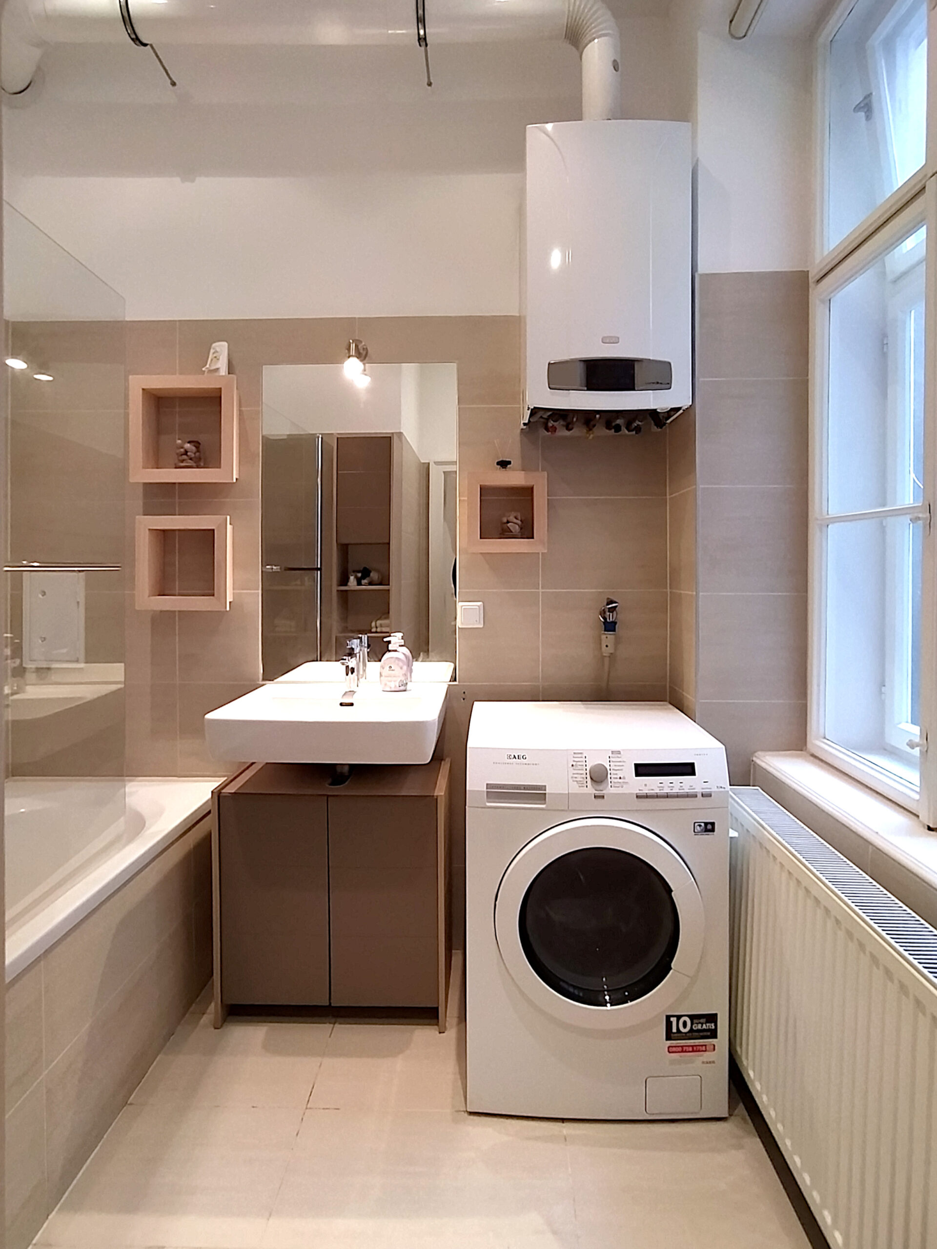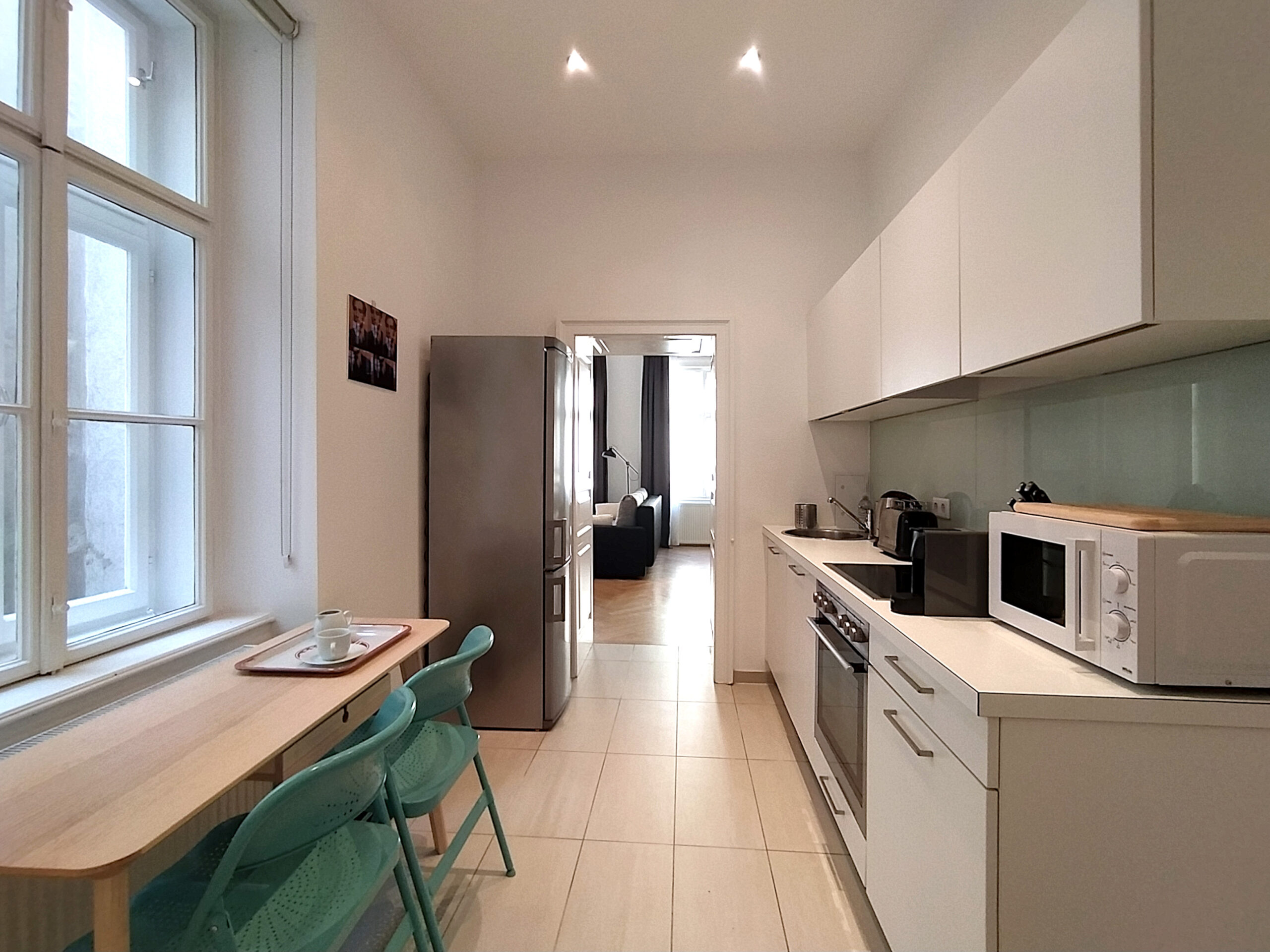Located on the second floor of a typical Viennese building „Gründerzeit Zinshaus“, this bright apartment consists of a living room, bedroom, kitchen and bathroom with shower and tub.