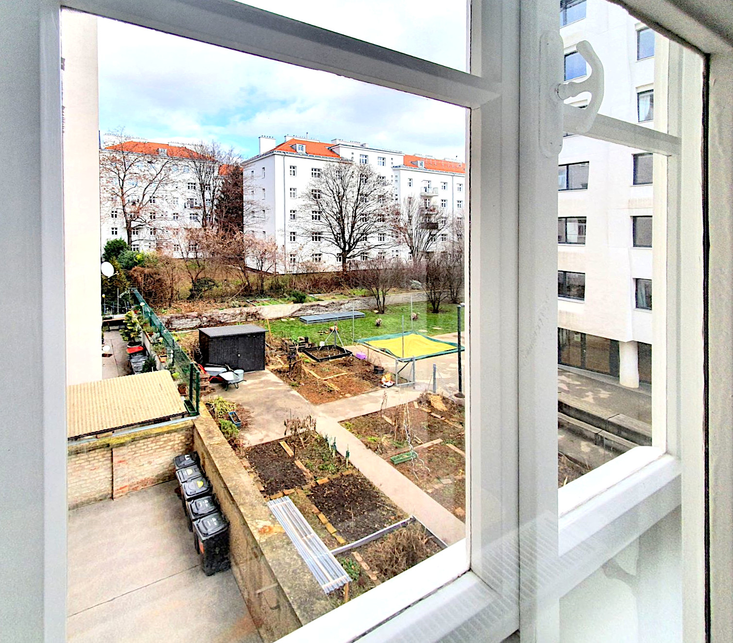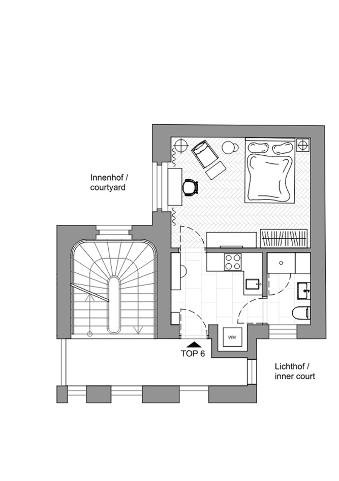 Located between ground floor and first floor („Hochparterre“) of a typical Viennese building „Gründerzeit Zinshaus“. This bright, one-room apartment combines living and sleeping area, offering a comfortable and open living space.